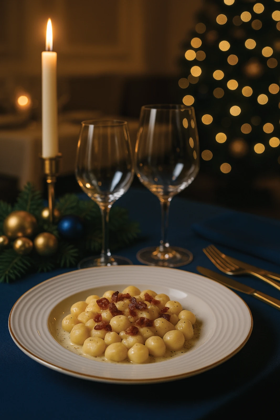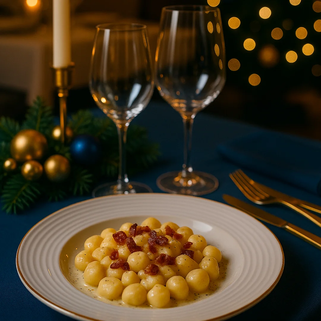 Gnocchi patate con cacio, pere e pepe con sfrigoli di guanciale croccante